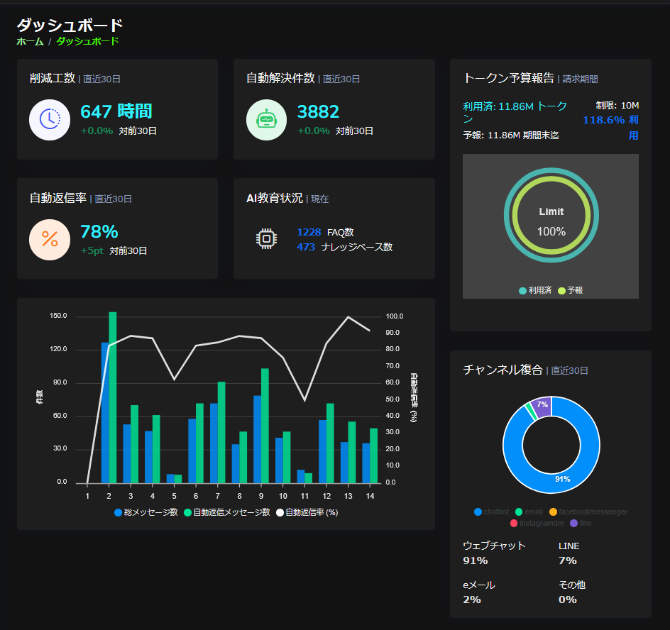 自動返信率、削減工数、対応件数などを可視化し、 AI運用の効果を継続的に把握できます。